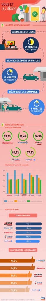 Dans une infographie, on apprend également qu’un internaute consacre 29 minutes en moyenne à réaliser ses courses en ligne ; met en moyenne 13 minutes pour se rendre dans un point de retrait et attend 6 minutes en moyenne pour se faire livrer sa commande.