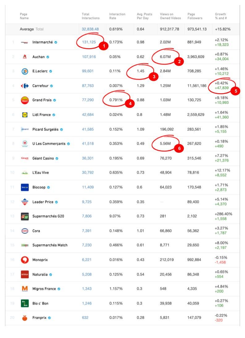 - Grand Frais épate par son taux d’engagement (Supermarché G20 aussi, mais avec une communauté nettement moindre). L’enseigne spécialisée dans la vente de Fruits et Légumes a le meilleur taux d’engagement des enseignes que j’analyse.