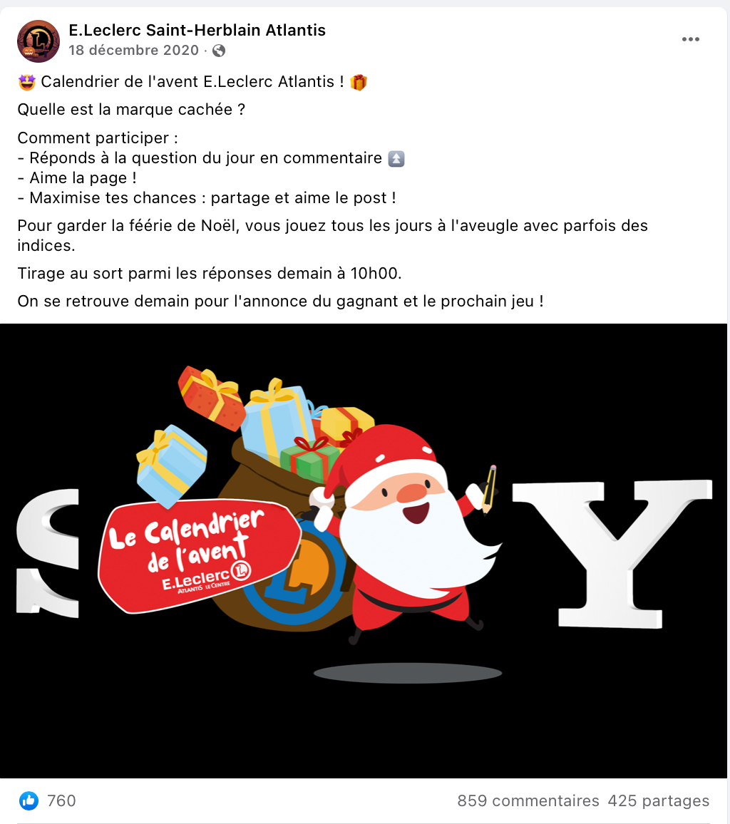 Ici un exemple avec E.Leclerc Atlantis qui a proposé l'année passée des jeux-concours régulièrement tout au long du mois.
