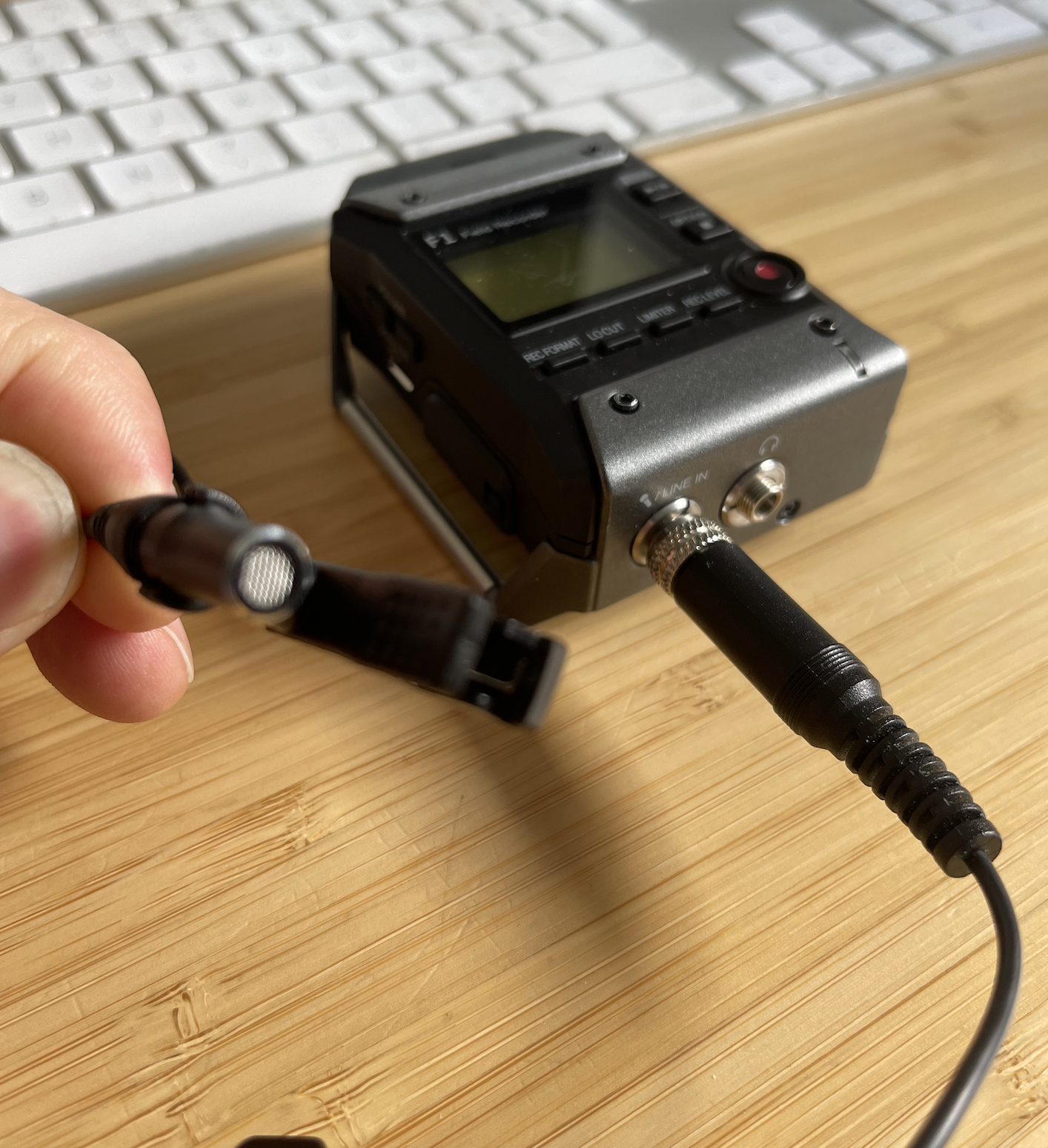 On peut trouver des versions sans fil qui se clipsent ou des versions avec fil. On a opté pour une version avec fil à deux canaux avec le Zoom F1-LP: un canal pour le micro et la voix de l’interviewé ; et un autre canal pour un retour son pour être certain que le son est optimal.
