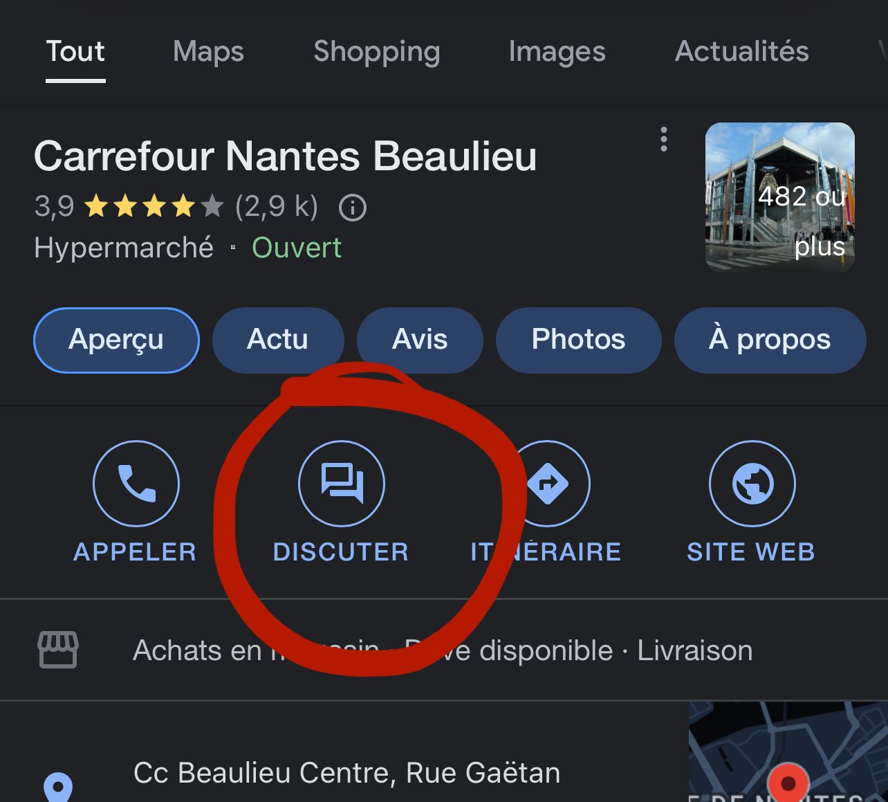 Pour se faire une idée précise de vers quoi on va, voici ci-dessous le bouton discuter sur les pages Google My Business qui permet d'envoyer un message texte à une entreprise.