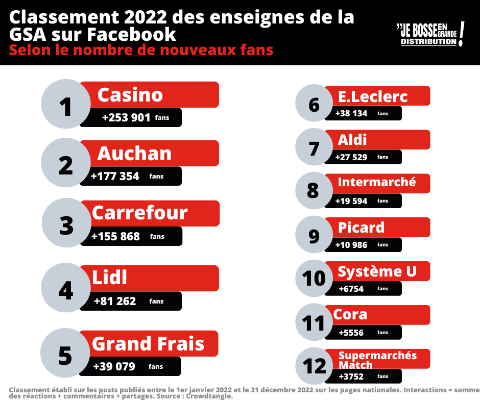 Cette année, l'enseigne qui a gagné le plus de nouveaux fans c'est Casino avec +253 000 nouveaux fans sur la page nationale. Auchan est 2ème avec +177 000 fans et Carrefour +155 000 fans est 3ème.
