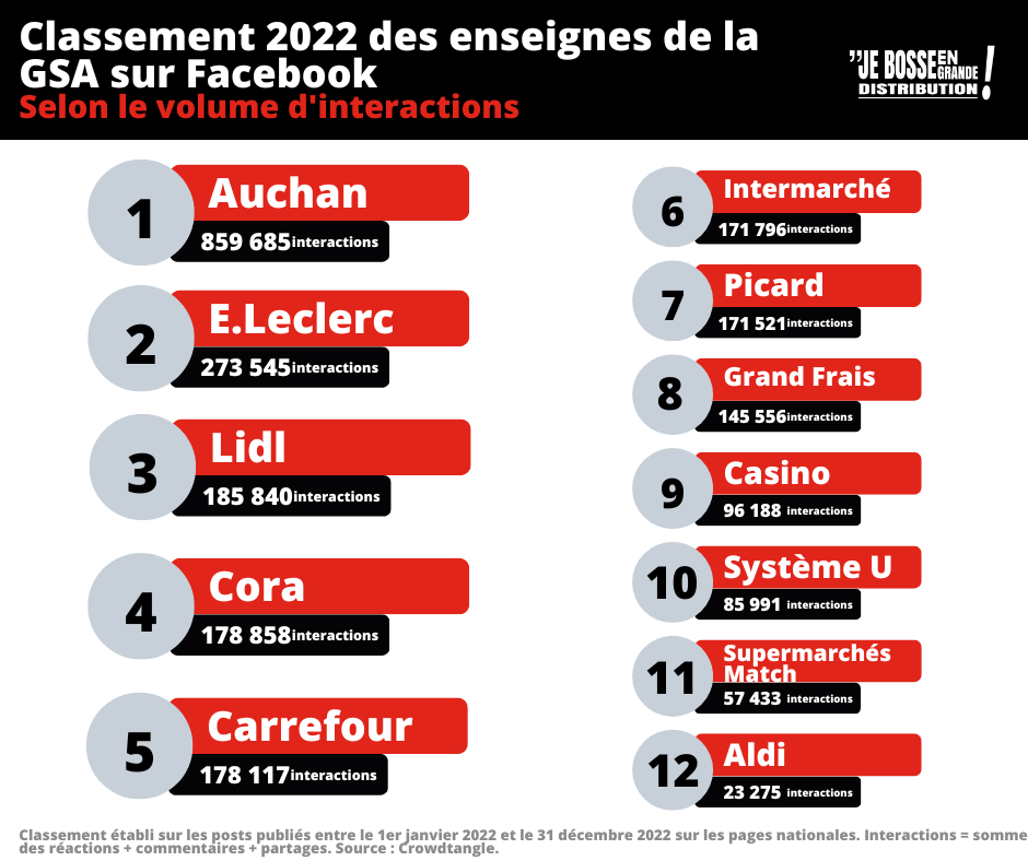 À ce jeu-là, c'est Auchan qui surclasse tout le monde en 2022 avec 859 685 interactions au total. C'est quasi 4 fois plus que le second, E.Leclerc qui est 2ème de ce classement avec 273 545 interactions. Lidl termine le podium avec 185 840 interactions.