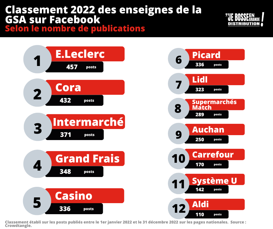 Sur le classement des enseignes qui partagent le plus de contenus, c'est E.Leclerc qui est l'enseigne la plus active avec 457 posts sur l'année, soit 1,25 post par jour. Cora suit le même rythme avec 432 posts, soit 1,18 post par jour. Et Intermarché est 3ème avec 371 posts, soit un peu plus d'un post par jour (1,01 pour être précis).