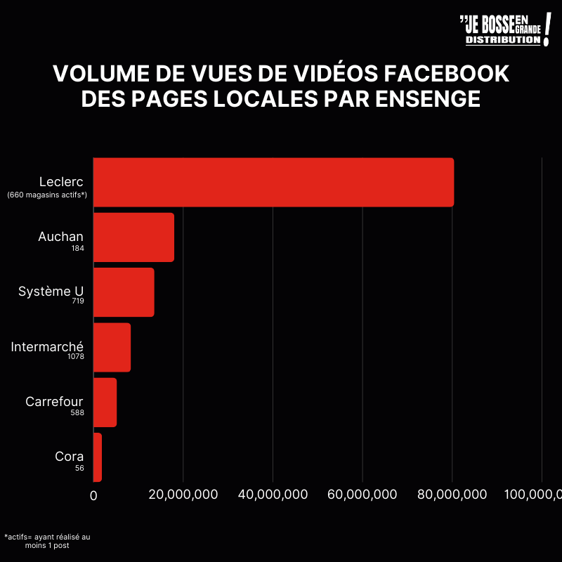 Au même titre que les interactions et le nombre de publications, Leclerc écrase la concurrence avec la vidéo. Toutes pages confondues, cela représente 80,4 millions de vues sur 12 mois.