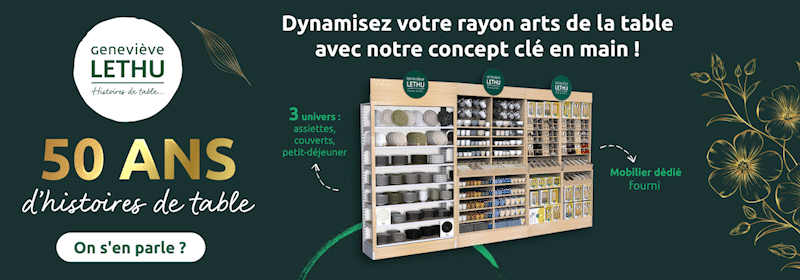En 2023, la marque d’art de la table Geneviève Lethu a opéré son grand retour avec une arrivée inédite dans les rayons de la grande distribution, sous la direction de Gers Equipement. Depuis, elle s'est imposée dans les grandes surfaces alimentaires (GSA) et spécialisées (GSS), offrant des produits tendances à des prix accessibles.