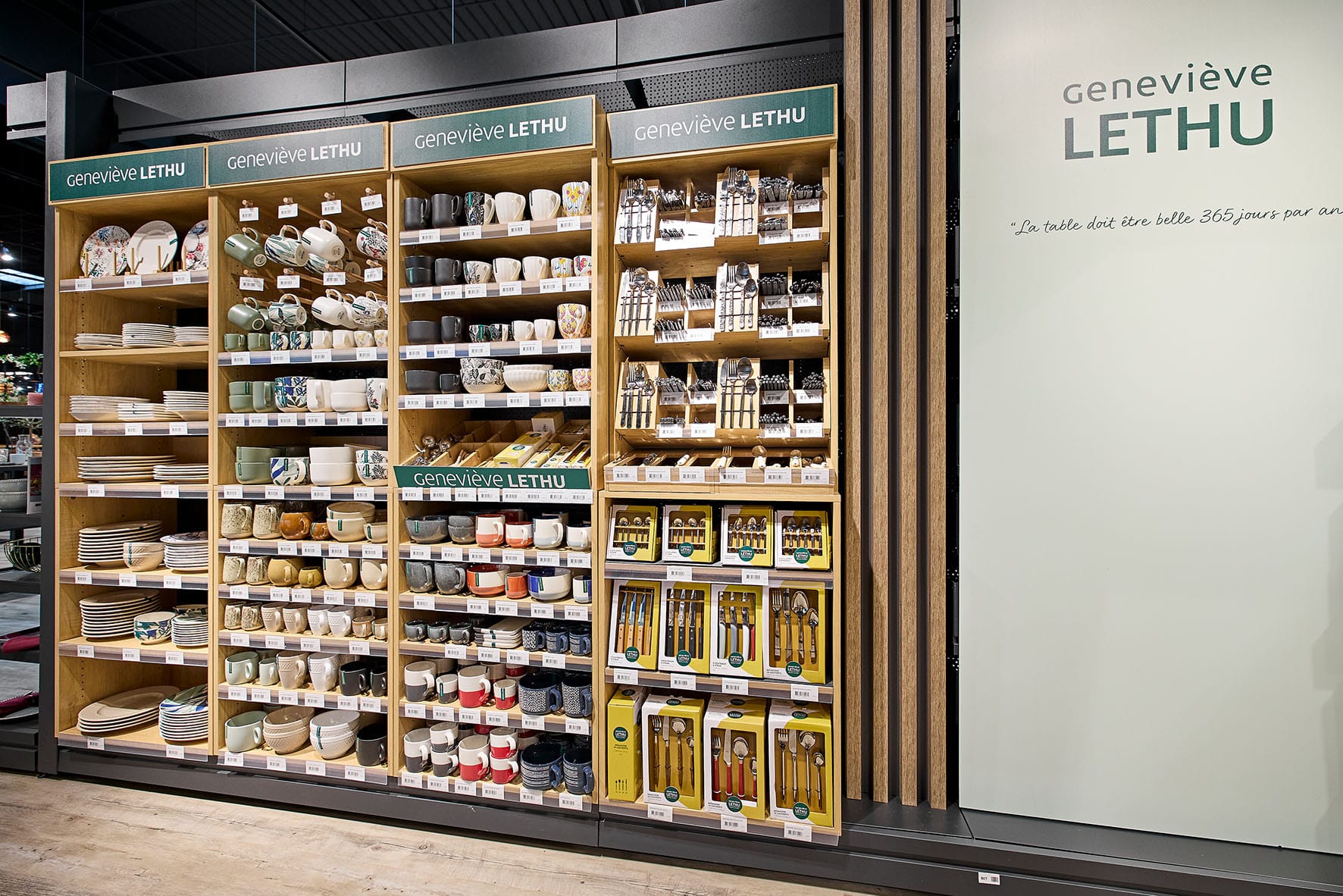 Les gondoles en bois, les luminaires choisis avec soin, et la PLV respectent l'identité visuelle chaleureuse de la marque, créant une atmosphère feutrée et conviviale. Cette présentation soignée attire les consommateurs dès les premiers mètres et permet à Geneviève Lethu de se distinguer des autres marques de vaisselle en rayon. En outre, les exclusivités et opérations fidélité comme les coffrets spéciaux pour Noël ou la fête des mères sont plébiscitées par les consommateurs et renforcent l’attachement à la marque.