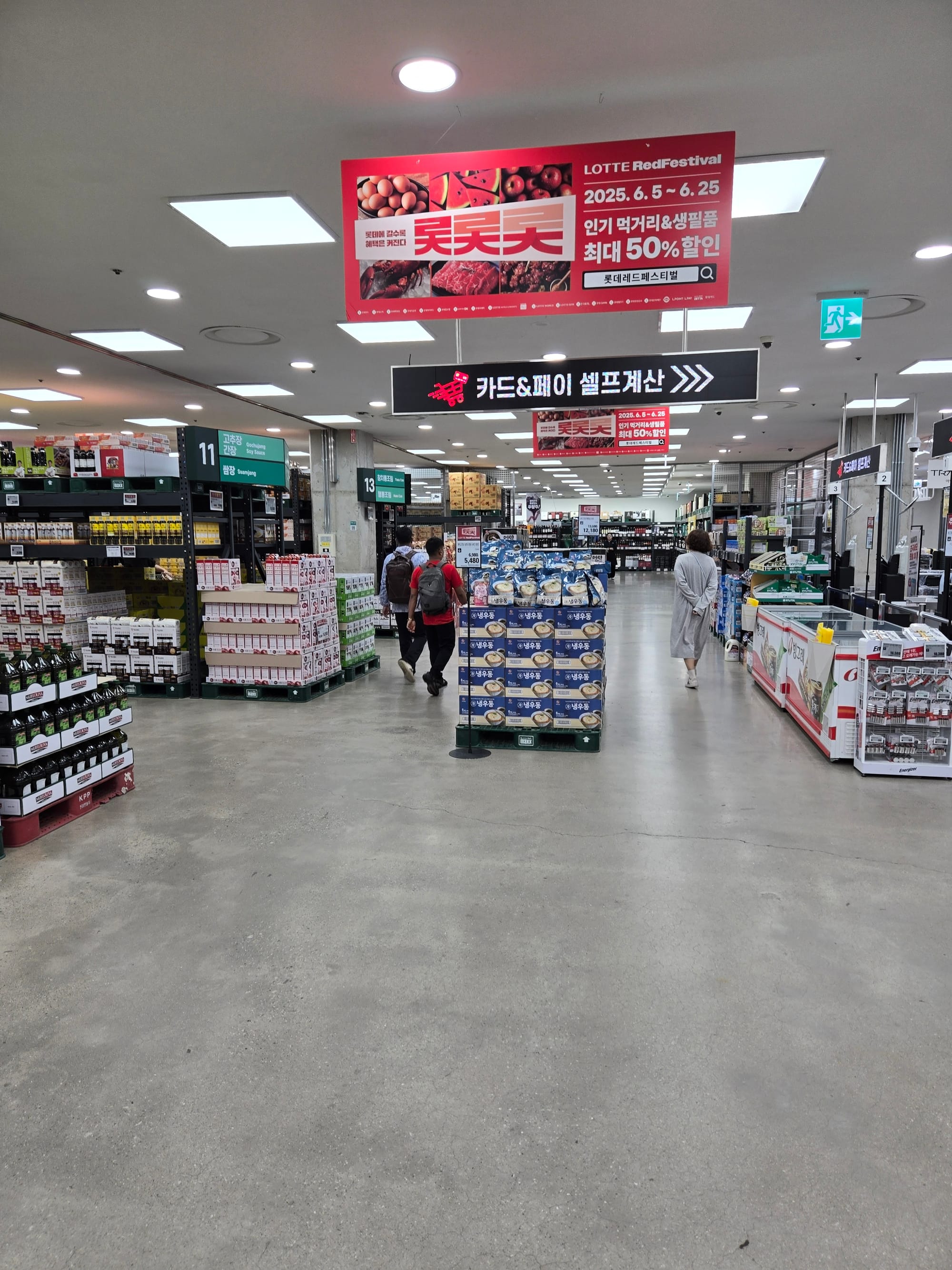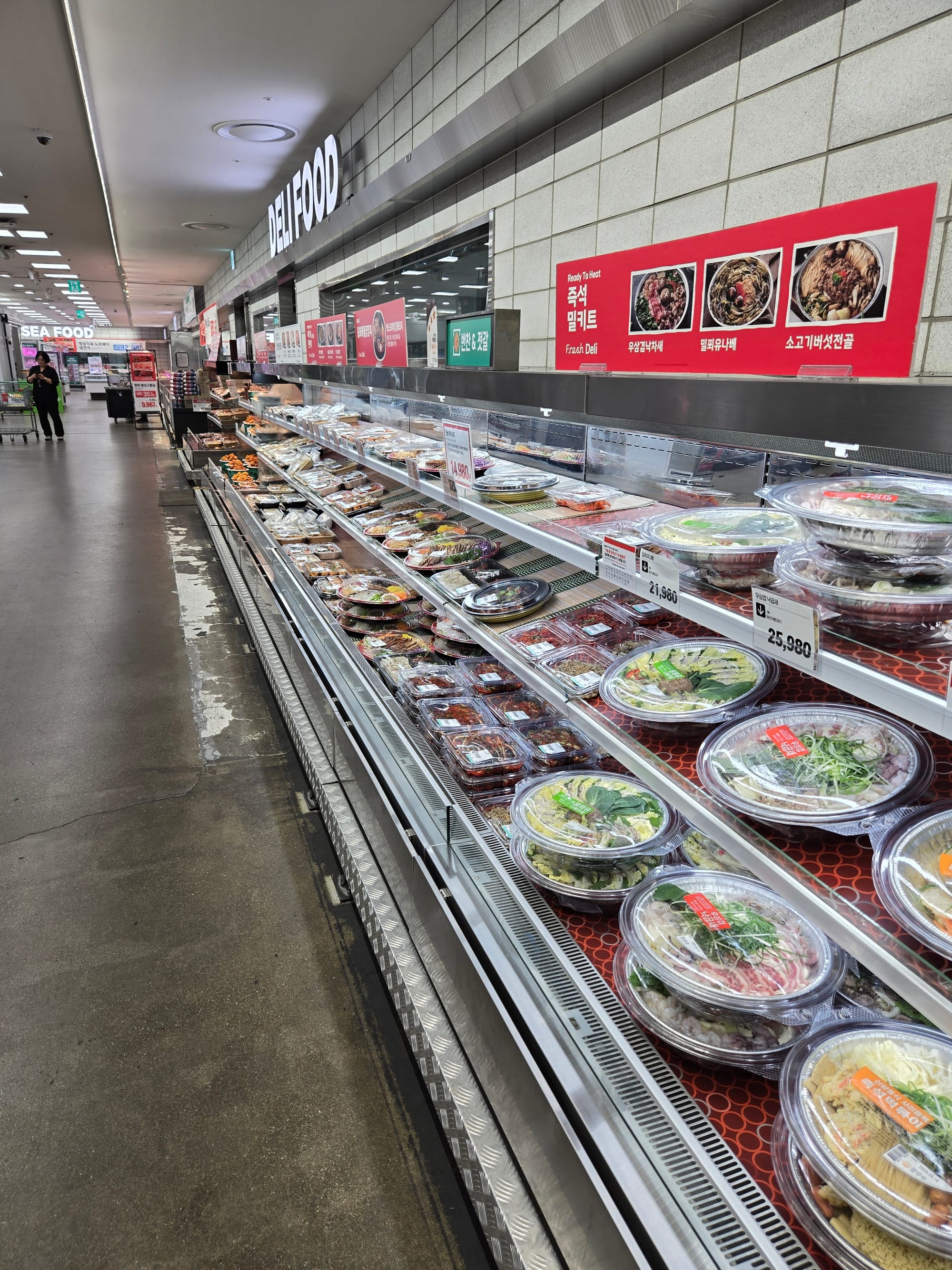 Une mise en scène minimaliste et fonctionnelle dans un environnement type entrepôt : à Lotte Maxx Mokpo, la priorité est donnée au prix et à l’efficacité. L’ambiance visuelle épurée, les palettes de promotion en allée centrale, et la zone traiteur en libre-service reflètent un modèle centré sur le volume, la rotation rapide et l’autonomie du client. Une offre de plats préparés variée vient compléter cette approche, répondant aux habitudes alimentaires locales où les repas sont souvent consommés hors domicile ou prêts à emporter.