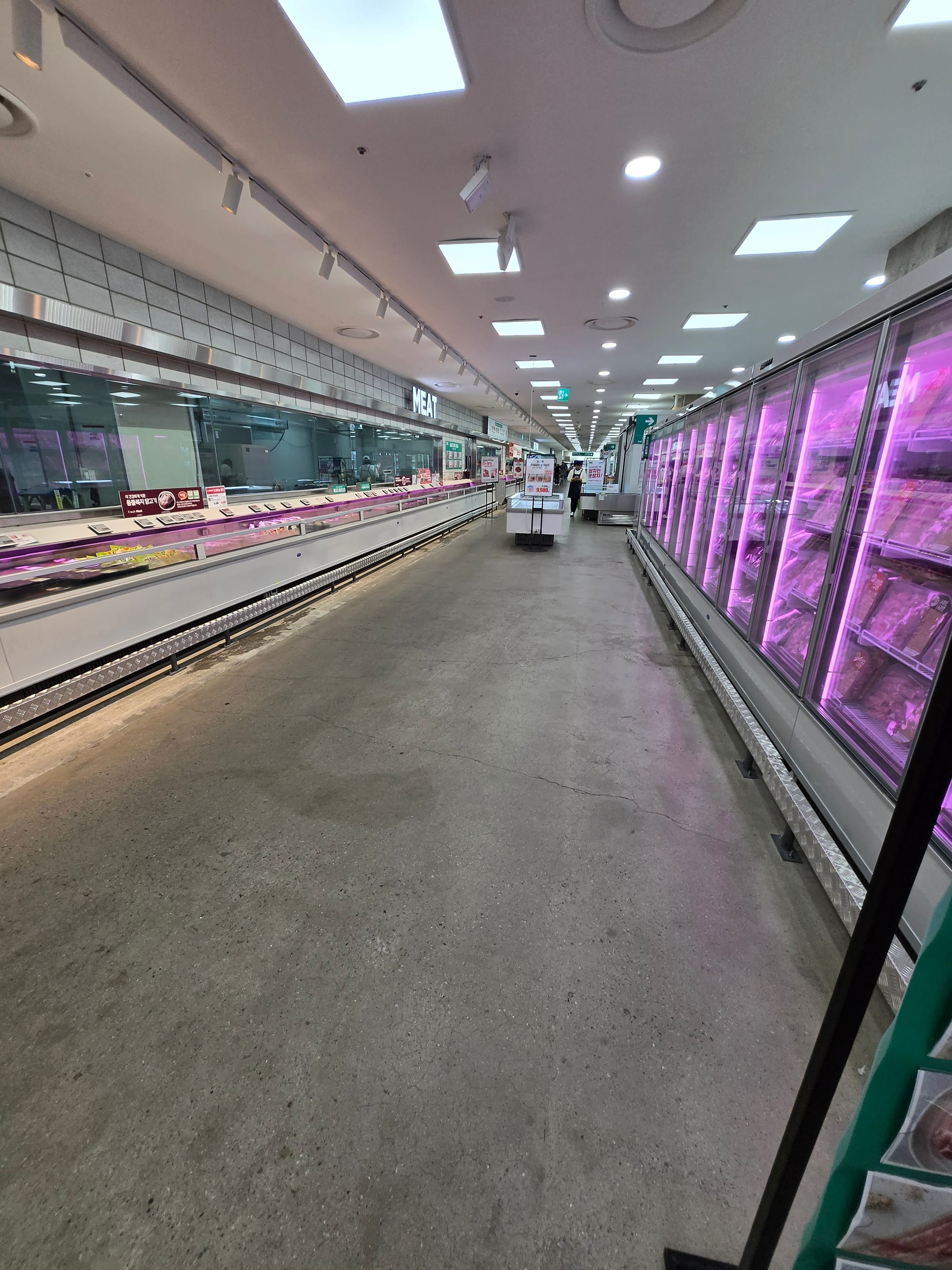 Le Lotte Maxx de Mokpo s’étend sur plus de 10 000 m², répartis selon une logique claire : le rez-de-chaussée concentre l’essentiel de l’offre alimentaire sur 5000 à 7000 m², tandis que le second étage accueille le non-alimentaire. Cette organisation verticale, caractéristique du retail urbain coréen, optimise les flux tout en préservant la densité commerciale.