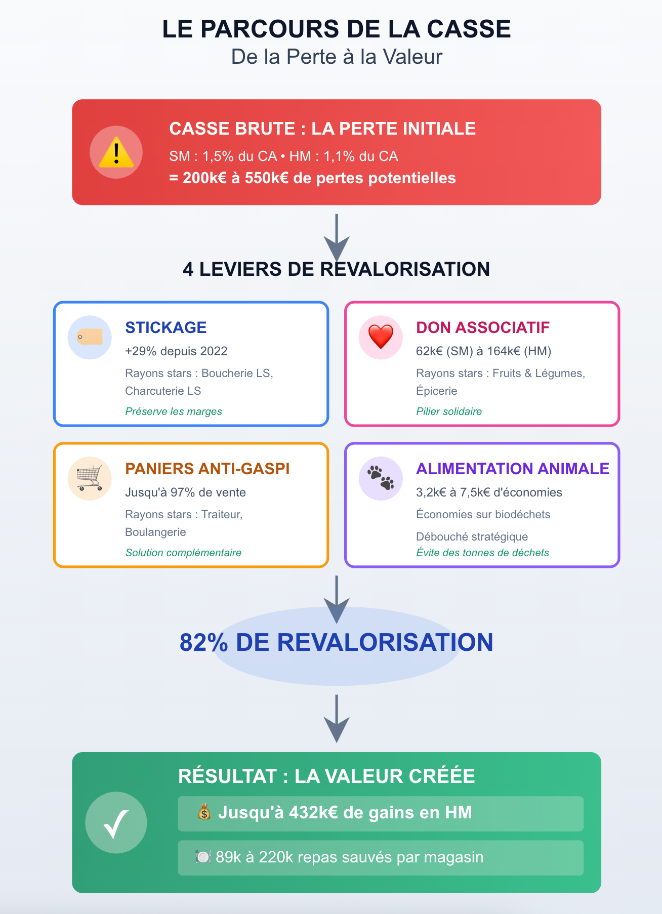 La saisonnalité joue un rôle déterminant : les produits festifs en décembre-janvier et les produits estivaux en juillet-août accentuent les variations de casse. L'enjeu n'est donc plus de constater la casse, mais bien de la transformer systématiquement en valeur, qu'elle soit économique, sociale ou environnementale.
