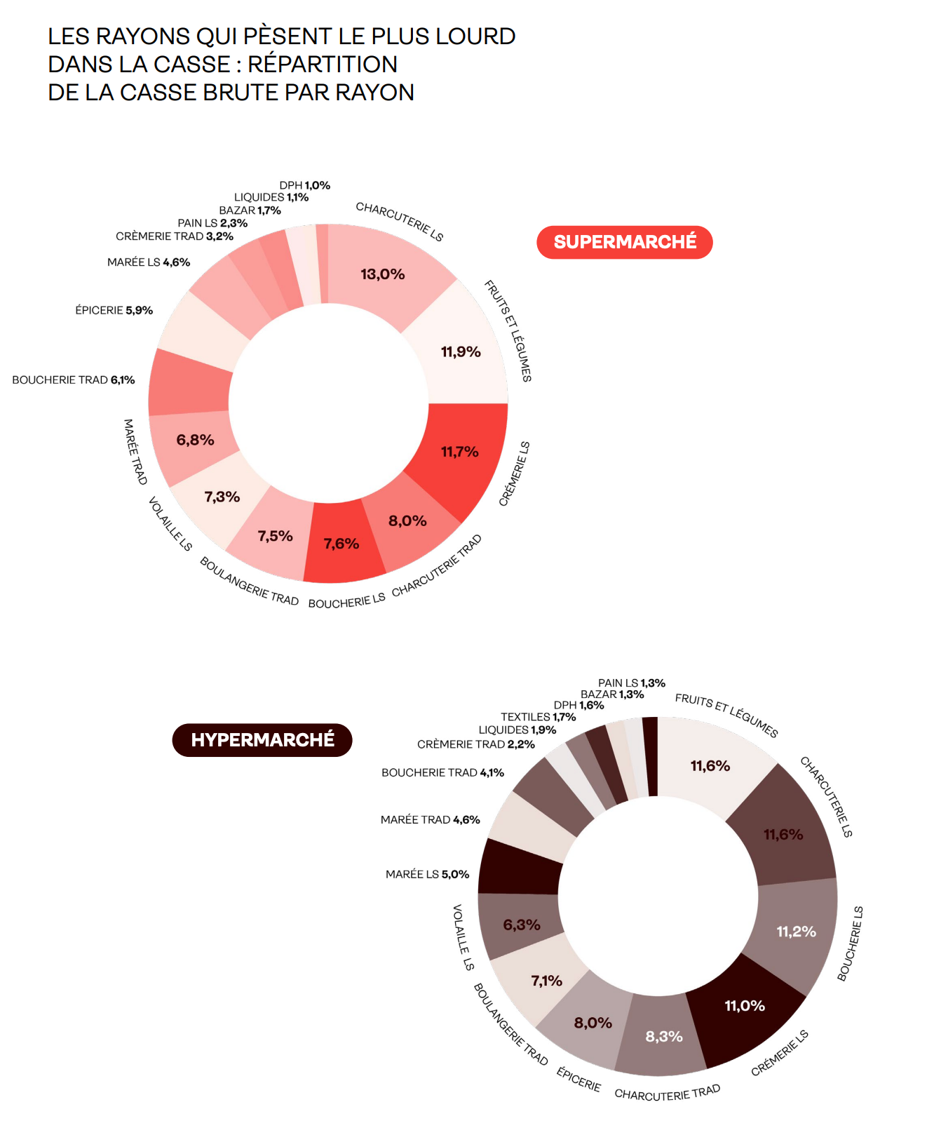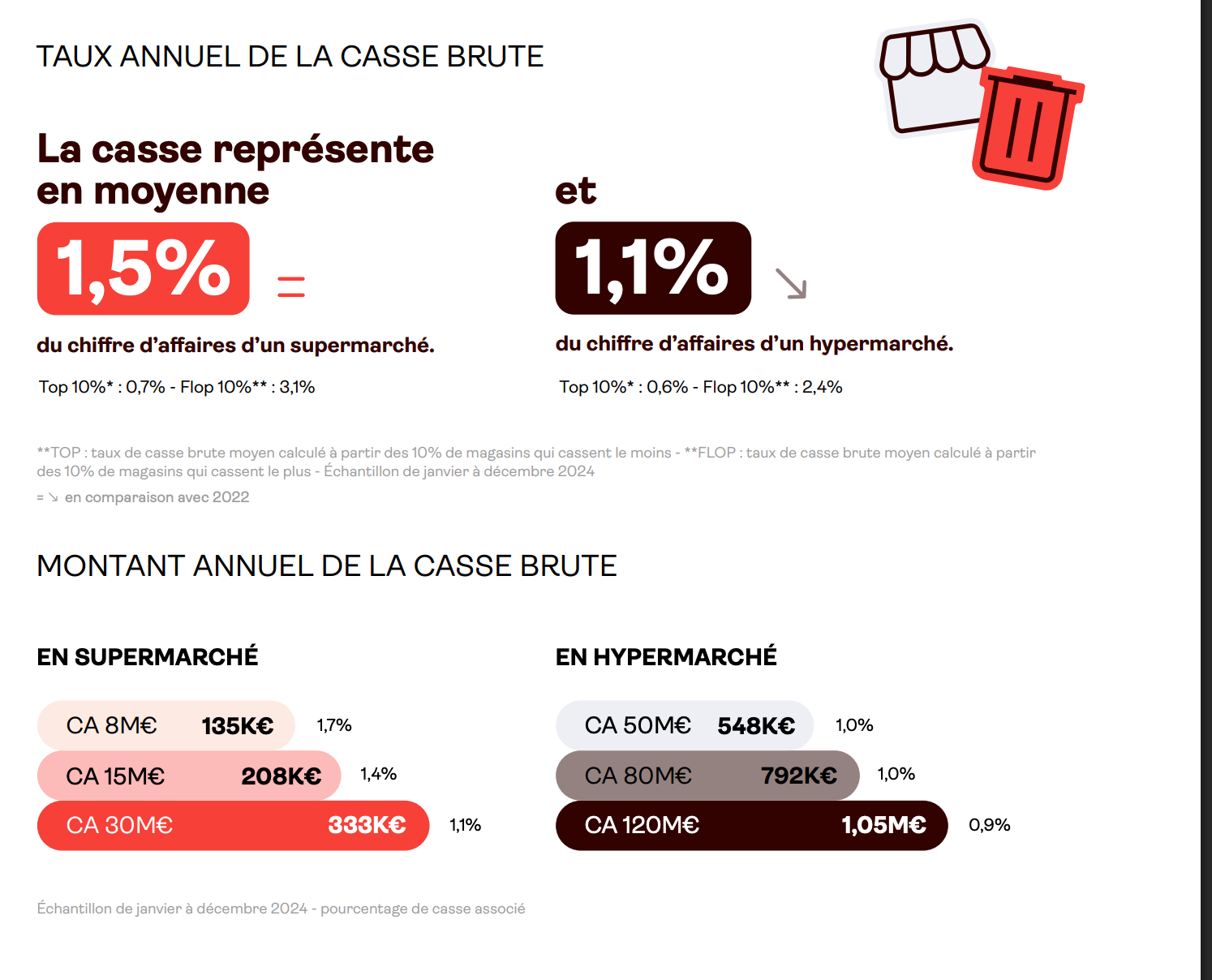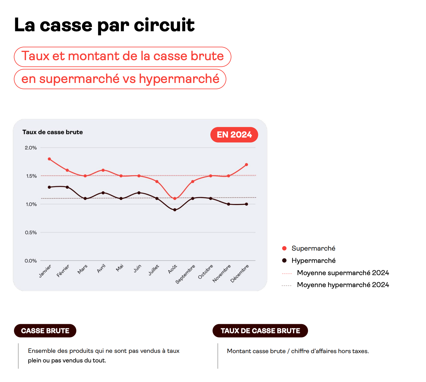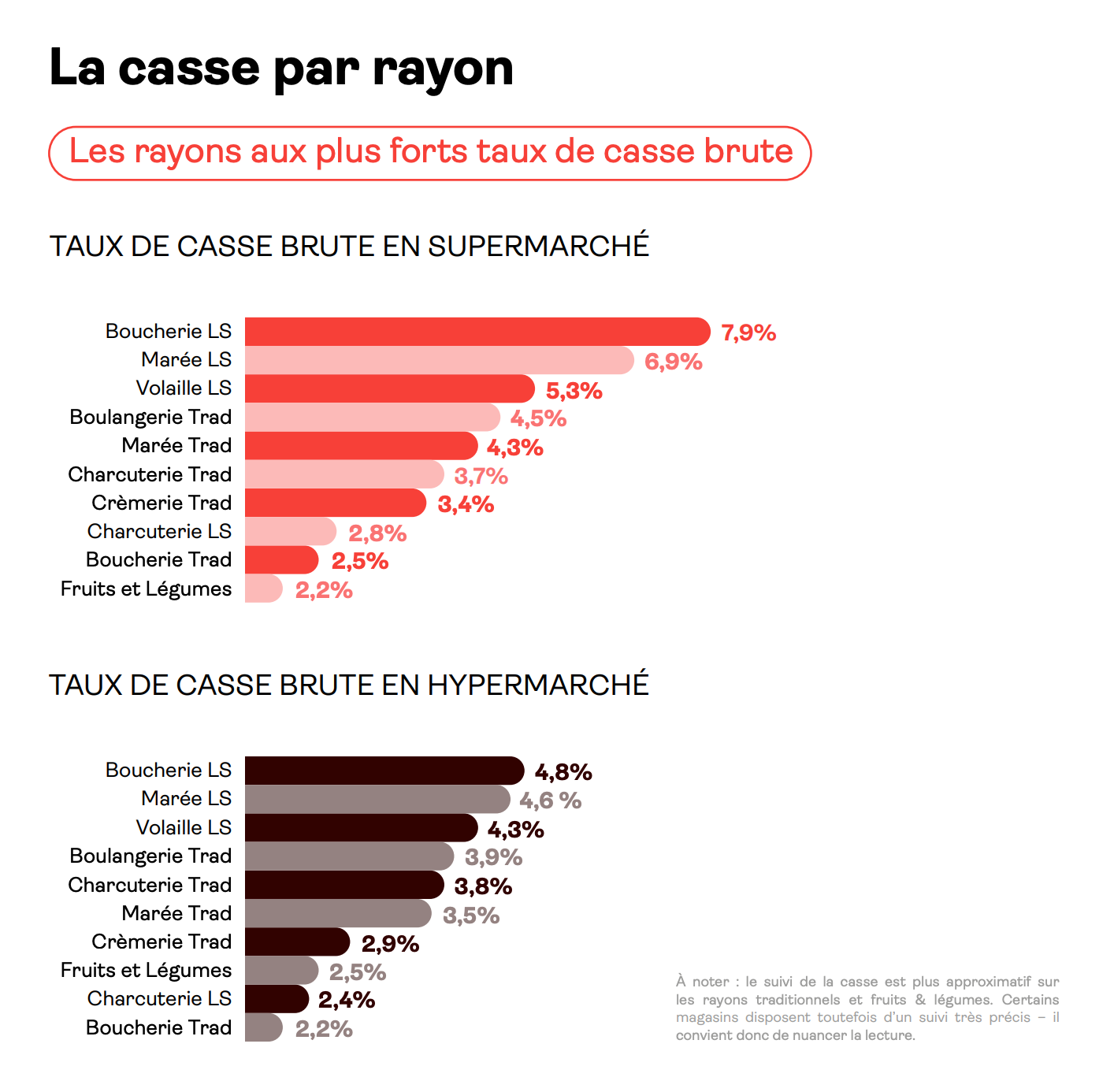 Les rayons les plus exposés sont identifiés avec précision : en supermarché, la Boucherie Libre-Service affiche un taux de casse de 7,9% et la Marée Libre-Service de 6,9%. Ces rayons frais, par leur nature périssable, constituent les points critiques où se concentrent à la fois le risque financier et le potentiel de revalorisation. Les Fruits et Légumes figurent également parmi les rayons à forte casse.