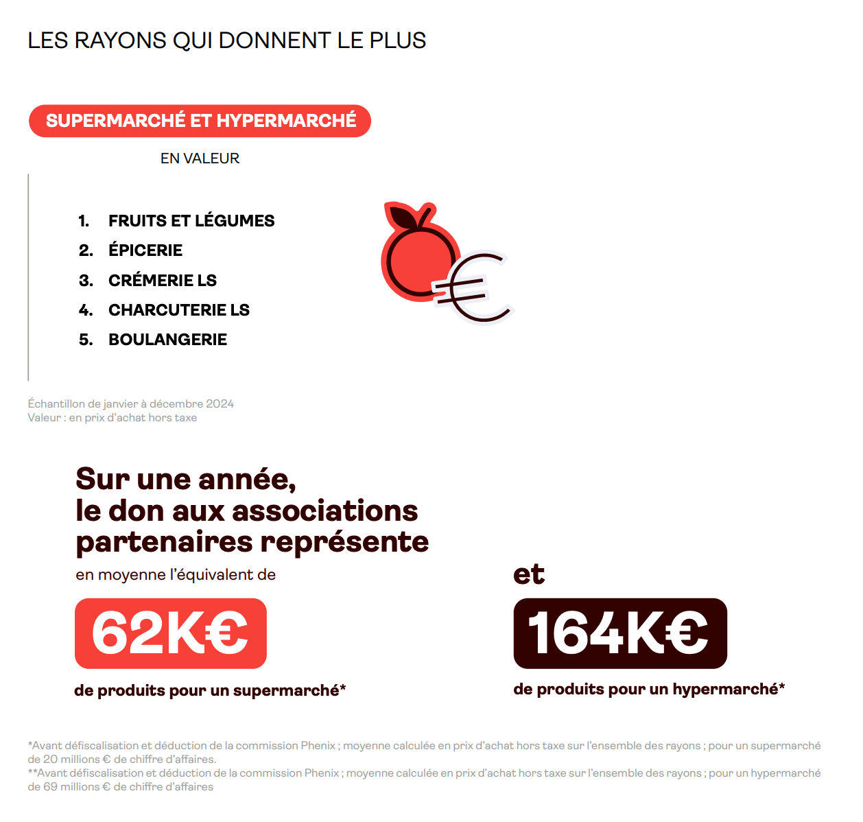 Le Don alimentaire représente le pilier solidaire de cette stratégie. En redistribuant les invendus encore consommables à des associations partenaires, les enseignes génèrent une valeur sociale considérable : 62 000€ de dons en moyenne par an pour un supermarché et 164 000€ pour un hypermarché. Les rayons qui donnent le plus en valeur sont les Fruits et Légumes et l'Épicerie, démontrant la complémentarité des solutions selon les catégories de produits.