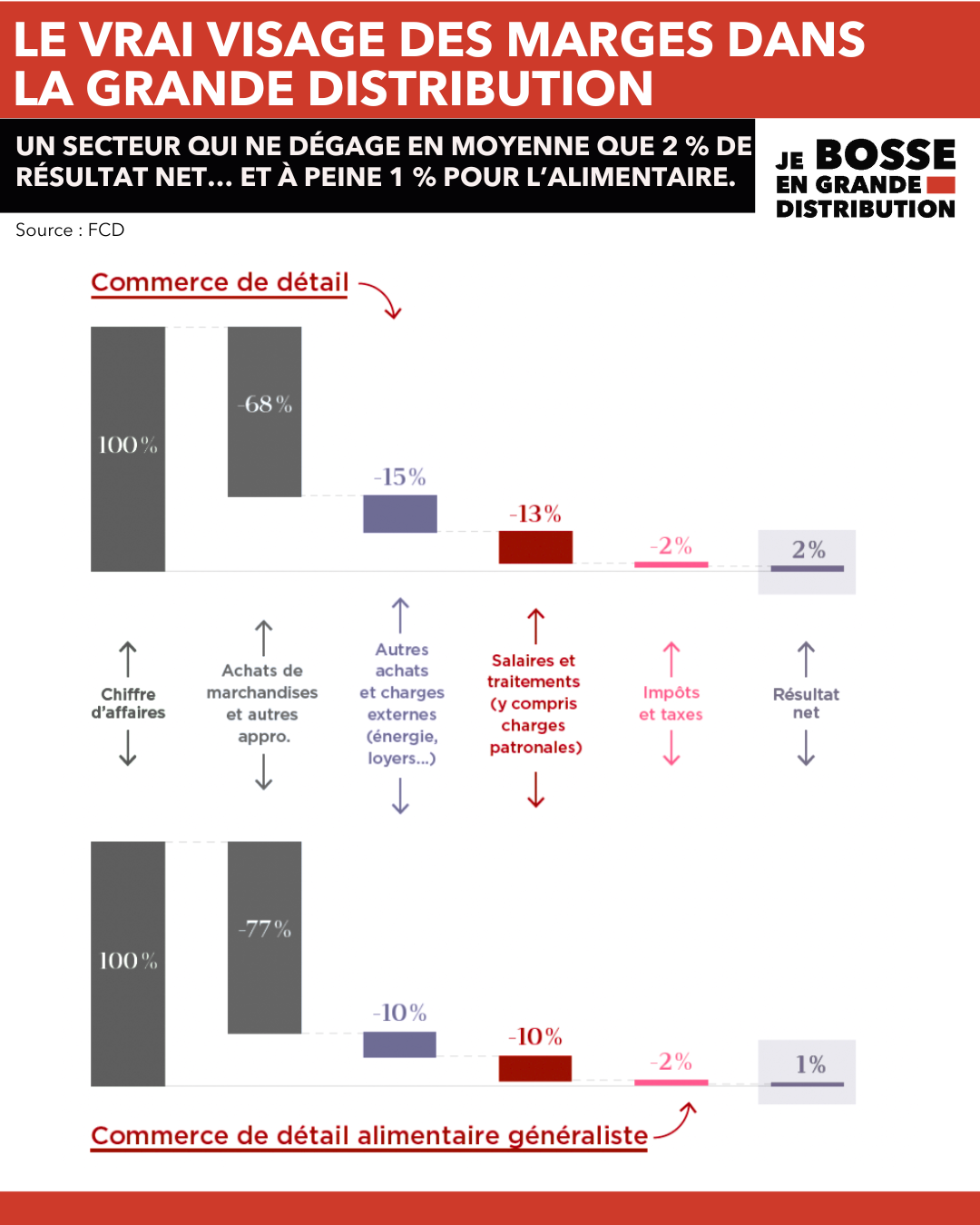 La réponse tient en un mot : volume. Le modèle économique de la grande distribution repose sur des volumes colossaux qui permettent de compenser les pertes sur certains rayons par des marges positives – mais extrêmement faibles – sur d'autres. Le résultat net global du commerce de détail alimentaire généraliste ? Seulement 1%. Un pour cent. Là où Coca-Cola affiche 21% de marge nette consolidée, où Pepsico atteint 15%, la grande distribution française tourne à 1%.