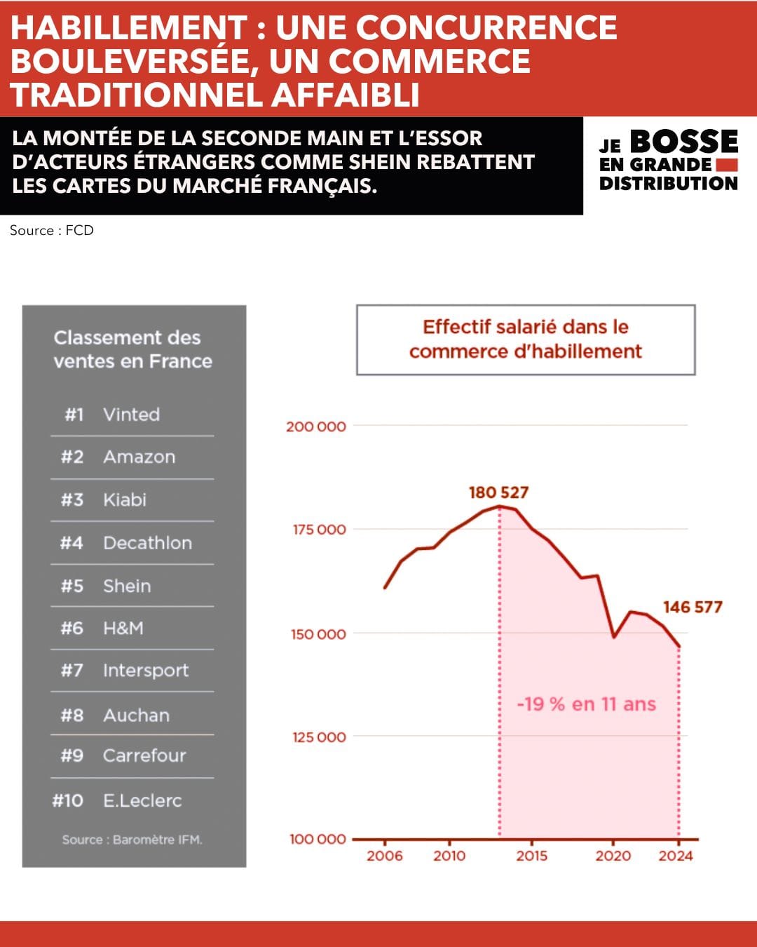 En onze ans, le commerce de détail de l'habillement a perdu 19% de ses effectifs salariés. Près d'un emploi sur cinq a disparu. Pendant ce temps, Shein inonde le marché de vêtements à prix cassés, Vinted capte la seconde main, et Amazon grignote toutes les parts de marché. Le textile n'est que le premier domino à tomber. Ce qui lui arrive aujourd'hui arrivera demain à d'autres secteurs. Bienvenue dans l'autopsie d'une mort annoncée.
