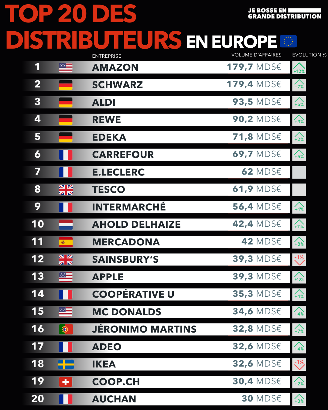 - L'Allemagne en force : Le top 5 reste largement dominé par les enseignes allemandes (Schwarz, Aldi, Rewe, Edeka).
